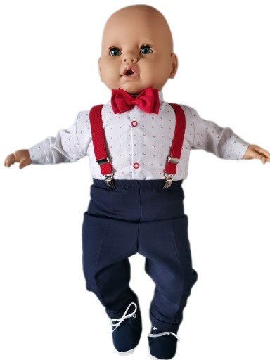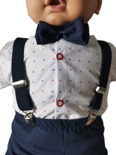 Модний набір для хрещення хлопчика в класичних кольорах білого і темно-синього або ніжно-сірого. Елегантний і водночас з цікавим елементом у вигляді підтяжок для штанів різних кольорів на вибір.