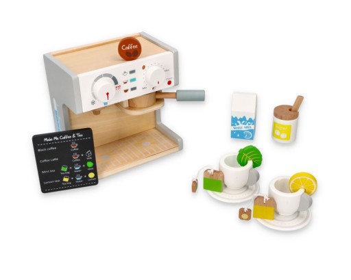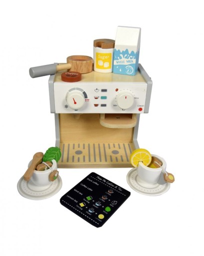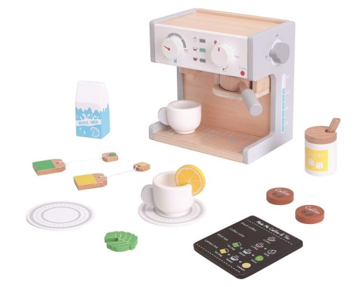 Комплект виконаний в нейтральних сіро-білих кольорах для хлопчика і дівчинки. Це все складається не лише з еспресо-машини, а й з багатьох цікавих аксесуарів. Іграшка виготовлена таким чином, щоб максимально точно відтворювати реальну діяльність. Ви знайдете тут, наприклад, чайні пакетики з ниткою, кавові капсули і, нарешті, лимон, який можна покласти на чашку, щоб усе виглядало чудово.