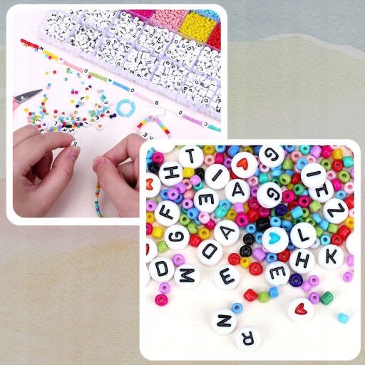 У набір входить дрібний бісер, силіконові гумки на котушці, круглі букви, ножиці, ланки і застібки, а також модні декоративні намистини.