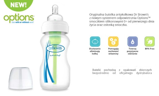Найновіші флакони Dr. Brown's дає батькам вибір, і ця пляшка з широким горлом є одним із варіантів. Його запатентована система вентиляції дозволяє годувати дитину без ризику заковтування повітря, яке часто викликає кольки та дискомфорт у немовлят. Завдяки цій інноваційній системі дитина зможе спокійно пити молоко чи інші напої.