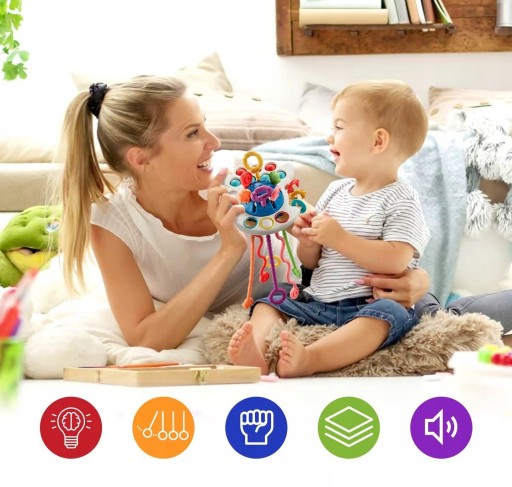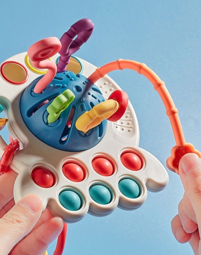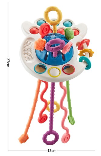 Він може привернути увагу вашої дитини під час тривалих подорожей машиною, поїздом чи літаком і занурити її у світ головоломок, коли вона відкриває для себе цю іграшку, смикаючи за текстуровану нитку, лопаючи бульбашки та весело рухаючи м’яч.