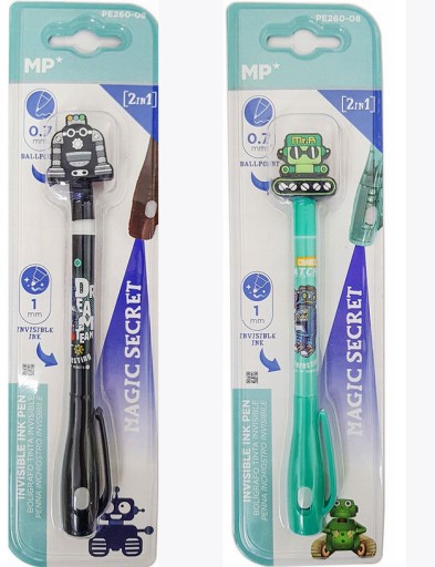 Справді чарівна ручка. Один кінець ручки - класична кулькова ручка з лінією письма 0,7 мм, інший кінець містить указку з «невидимим» чорнилом. Щоб прочитати написане нею, потрібно посвітити спеціальним ліхтариком у ковпачок ручки.