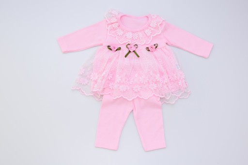 - Рожева сукня з довгим рукавом. Сукня має еластичний верх, бавовняну підкладку, мереживну спідницю та комір. Застібається на застібку на плечі. На лицьовій частині є 3 декоративні рички.