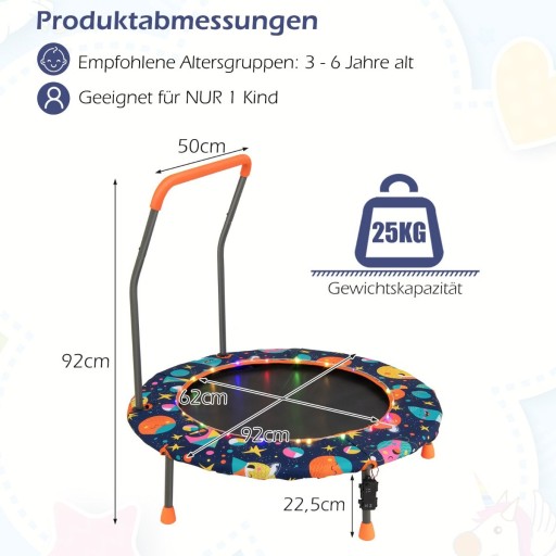 Подаруйте своїй дитині щасливе та здорове дитинство з нашим міні-батутом для малюків! Килимок для стрибків виготовлений з високоякісного PP матеріалу з високою пружністю. Крім того, захисний чохол з м’якою тканиною Оксфорд і міцні шнури банджі додають безпеки та довговічності. Оснащений 21 красивою світлодіодною лампочкою, він приверне увагу дитини та забезпечить нескінченне задоволення. Крім того, під час стрибків діти можуть хапатися за ручку. Нековзкі та безшумні накидки для ніг TPR дозволяють вашій дитині стрибати в будь-який момент, не створюючи зайвого шуму.