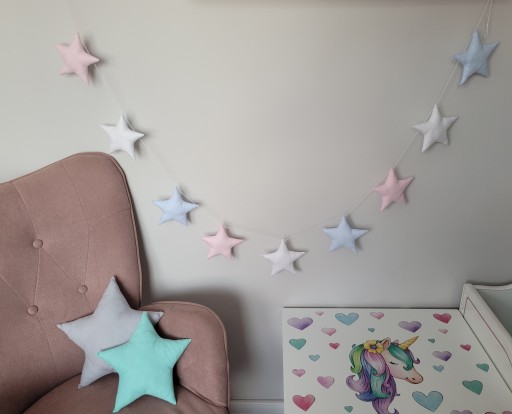 Гірлянда з дев'яти зірок кольорів: пудровий, шавлія, світло-сірий. Підвішується на бавовняному гачку, довжиною приблизно 250 см. Розмір зірки приблизно 14 см. Для горизонтального і вертикального підвішування. Товар ручної роботи, новий, запакований.
