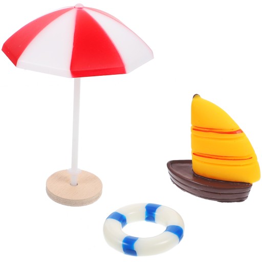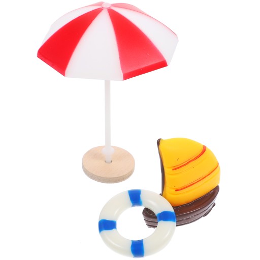 Ці мініатюрні пляжні предмети включають різноманітні аксесуари, такі як пляжні човни, кільце для плавання та парасолька. Ці мініатюрні пляжні предмети виготовлені з пластику для міцності, довговічності та безпечної гри. Простий у використанні та включений у мікроландшафтні проекти своїми руками.