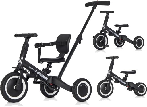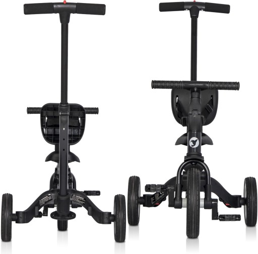 Завдяки інноваційній запатентованій системі, натиснувши всього 3 кнопки і не розбираючи жодних елементів, ви можете перетворити триколісний велосипед на практичний навчальний велосипед для балансування. Просто з'єднайте задні колеса в одне стійке подвійне колесо та зніміть педалі. Педаль можна демонтувати, натиснувши лише одну кнопку, і інструменти не потрібні. Велосипед вважається найкращим способом навчитися їздити на велосипеді. Ваша дитина швидко навчиться тримати рівновагу і пересісти на звичайний двоколісний велосипед буде лише формальністю. У цій конфігурації педалі, спинка і направляюча (штовхач) знімаються.