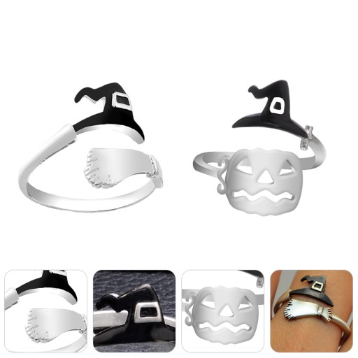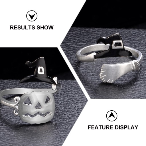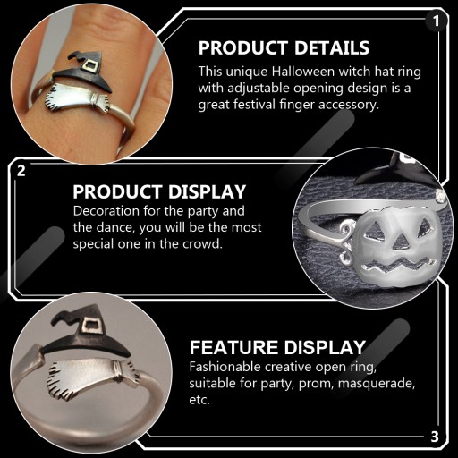 Це набір кілець відьомських капелюхів на Хелловін. Матеріал сплаву, зносостійкий, стійкий до падіння, висока міцність. Його можна використовувати як взаємозамінні з чорним і сріблястим. Фестивальний дизайн кільця, підходить як для дорослих, так і для дітей. З цією каблучкою відьомського капелюха ви станете особливішими.