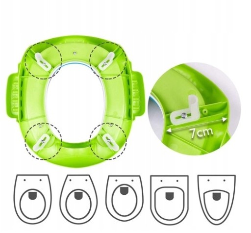 - монтажні гачки, прикріплені внизу, які можна вільно регулювати та адаптувати до будь-якого сидіння унітазу. Спеціальна система кріплення забезпечує надійне кріплення та запобігає ковзанню сидіння.