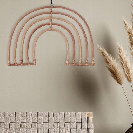 : Веселка з ротанга в богемному стилі, вишукана та красива, елегантна прикраса для дому. Виготовлена з екологічно чистого ротанга. Поверхня гладка та безпечна для дітей. Веселка з ротанга чудово виготовлена вручну, щоб повісити її на стіну в дитячій кімнаті або в стилі бохо. день народження, Різдво, дитячі вечірки, рік або інші свята Ви можете відобразити цю веселку в дитячій кімнаті, повісивши її на стіну за допомогою металевої трикутної вішалки, що входить до комплекту, або просто притуливши до настінного мистецтва для додаткового розміру