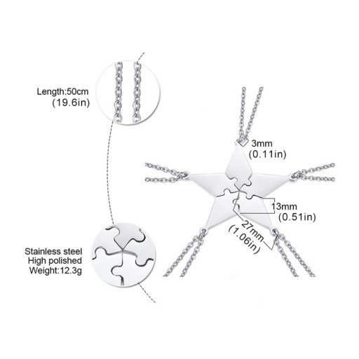 Ten produkt to zestaw najlepszych naszyjników rodziny lub przyjaciół. Jest wykonany z materiału i może być używany przez długi czas. Projekt puzzli w kształcie pięcioramiennej gwiazdy sprawia, że jest to wyjątkowa rzecz dla przyjaciół, którzy mogą ją posiadać i nosić razem. Łatwy do przenoszenia, możesz go nosić gdziekolwiek jesteś.