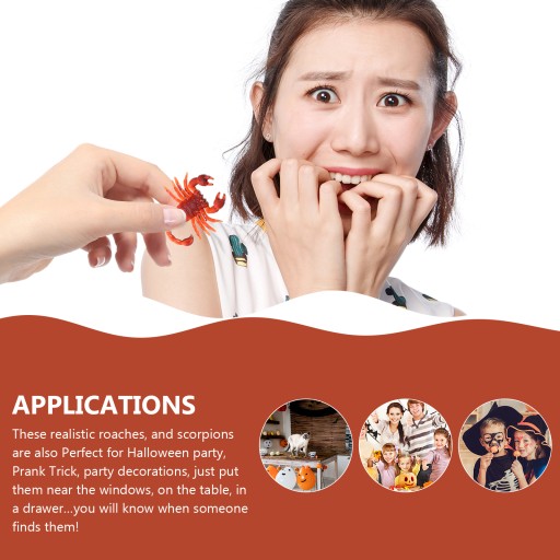 Ці реалістичні таргани та скорпіони також ідеально підходять для вечірок на Хеллоуїн, трюків, прикрас для вечірок, просто розмістіть їх біля вікон, на столі, у ящику, і ви дізнаєтесь, коли хтось їх знайде!