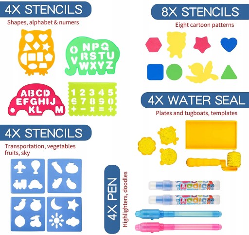 Покращений світловий килимок. Діти використовують водяну або світлову ручку, намальований візерунок буде барвистим і світиться. Складається для зручного зберігання. Портативний для використання в приміщенні/зовні та подорожей. Чудові розвиваючі іграшки для дівчаток 3 4 5 6 років Великий розмір килимка Велика область для Doodle, 39,5 X 31,5 дюймів. Розмір килимка для водного малювання достатній для одночасного малювання 2-4 дітей. У комплект входить: килимок x 1 ручка x 4 форма для малювання x 8 трафарет для малювання x 4 - Для віком від 3 років Безпечний і багаторазовий Без фарби, нетоксичний, не забруднює, чистий і безпечний для дітей. Наповніть ручку чистою водою і малюйте на килимку, через 3-10 хвилин він чарівним чином зникає (залежно від температури та потоку повітря), і діти можуть малювати на килимку знову і знову.Вчіться під час гри Килимок для малювання чудовий іграшка для вашого малюка, яка може стимулювати дитячу уяву та творчі здібності, дозволяючи їм вивчати азбуку, форми та кольори. Це не тільки іграшка, але й зв'язок між вами та вашими дітьми Ідеальний подарунок для дітей Ця чарівна подушка для малювання водою дозволяє вашій дитині малювати з друзями на столі чи підлозі, розвиває малювальні та творчі навички. Набори для малювання — чудовий спосіб покращити координацію рук і очей і дрібну моторику. Найкращий вибір для дитячого подарунка на день народження чи Різдво.