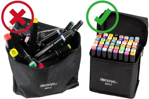 У набір з маркерами входить відповідна кришка з міцного водонепроникного матеріалу. Має зручну ручку, що робить переміщення та транспортування ручок ефективним та зручним. Також він займає мало місця в шафі. На додаток до обкладинки ви також отримаєте пластиковий органайзер, який розташований у нижній частині обкладинки та забезпечує стійкість маркерів і гарантує, що кожен з них має своє місце. Ви можете будь-коли вийняти органайзер з футляра, щоб було легше діставатися до маркерів під час малювання.