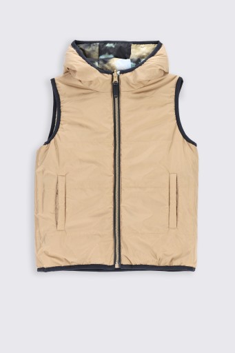 Двостороння стьобана жилетка з колекції OUTERWEAR BOY KIDS може стати термопрошарком, який доповнить стиль. Така безрукавка поверх світшота буде ідеально поєднуватися з джинсами і кедами. Великою перевагою жилета є те, що він має дві різні сторони. Одна з них має суцільний принт краватки, інша однотонна, без принтів. Оснащений капюшоном, який захищає голову від вітру та холоду, що ідеально підходить для дітей, які не люблять головні убори.