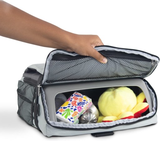 - Багатофункціональність: у цьому відділенні можна зберігати такі предмети, як підгузки, пляшечки, серветки, гаманець і мобільний телефон, а також функціонувати як дитяче сидіння та пропонувати доступ до цих речей, коли дитина сидить