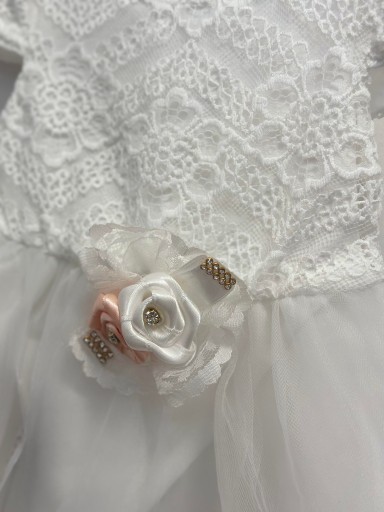 Красиве плаття для хрещення або іншого урочистого випадку. Має підкладку, завдяки якій дитина відчуває себе комфортно, нічого не подряпає і не поранить. Застібається на кнопку. Гра оздоблена м'яким мереживом, сукня D має 2 шари фатину і підкладку. Спереду є декоративна квітка, яку можна від'єднати.