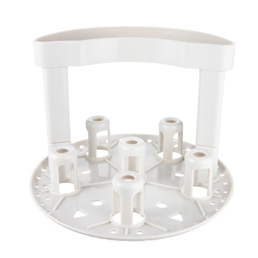 Поставте пляшки догори дном на раму, пропустивши їх крізь стабілізатор пляшок і поклавши на виступи основного кошика. Потім встановіть і зафіксуйте кошик на ніжці, а потім помістіть в нього всі аксесуари. Помістити зібрану конструкцію в корпус стерилізатора і накрити кришкою.