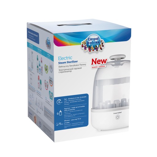 Електричний паровий стерилізатор дозволяє швидко і зручно дезінфікувати приладдя для годування та догляду за малюком. Одночасно вміщає 5-6 пляшок та інші дрібні аксесуари. Дезінфекція займає до 8 хвилин і використовує лише 75 мл води для всього процесу. Стерилізатор простий і інтуїтивно зрозумілий у використанні, управління здійснюється однією кнопкою. Це безпечно, автоматично вимикається після закінчення дезінфекції. Він має спеціально розроблений контейнер для фільтра, який полегшує видалення води та забруднень після процесу дезінфекції. Не потребує використання додаткових хімікатів. До стерилізатора приєднані щипці, що дозволяють видалити гарячі елементи.