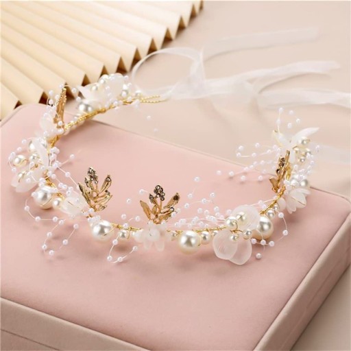Весільні аксесуари для волосся для нареченої складаються з штучних перлів і штучних квітів. Золотий сплав витканий і загорнутий. Завдяки цьому гумка для волосся має м'які властивості. Його можна підігнати під задану форму.