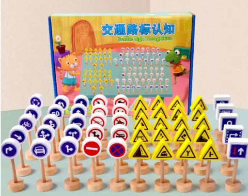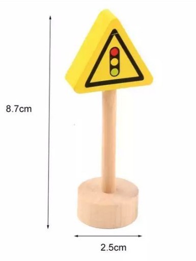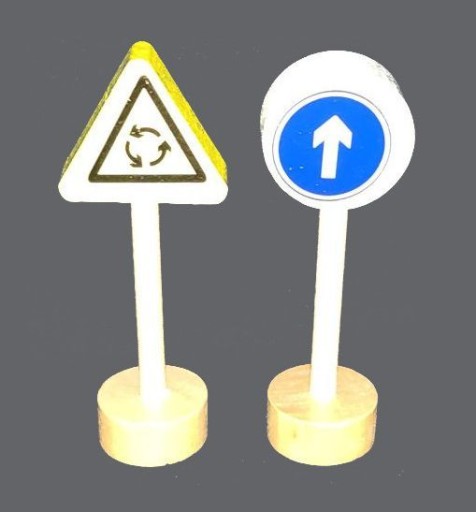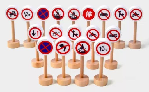 Набір дерев'яних дорожніх знаків. Це допоможе вам вивчити правила дорожнього руху і зробить гру з іграшковими машинками більш привабливою. У наборі 50 двосторонніх табличок на підставках.