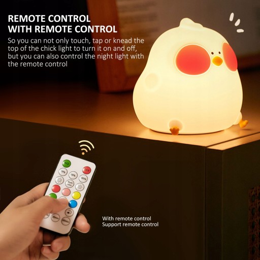 4. ДИСТАНЦІЙНЕ КЕРУВАННЯ: курча нічник постачається з пультом дистанційного керування, тож ви можете не лише торкатися, торкатися та м’яти верхню частину курчати, щоб увімкнути та вимкнути його, але й керувати нічником за допомогою пульта дистанційного керування.
