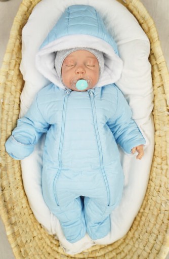 Ползунки з капюшоном, застібаються від промежини до шиї на дві зручні блискавки - вони полегшують новоспеченим батькам одягання дитини. Костюм складається з 2 шарів. Синя стьобана тканина куртки зовні, біле хутро всередині. Капюшон з м'якою хутряною підкладкою захищає голову дитини від холодних поривів вітру. Рукава і капюшон оздоблені витонченими хутряними вставками, які в рукавах можна закатати, щоб закрити ручки дитини. Стьобаний костюм має внутрішній шар утеплювача, тому ідеально підходить для холодних днів.