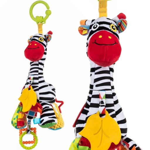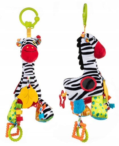 Зебра має дві брязкальця, безпечне дзеркальце для самостійного знайомства малюка, бирки з матеріалу з різними текстурами та кольорові прорізувачі.
