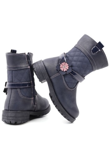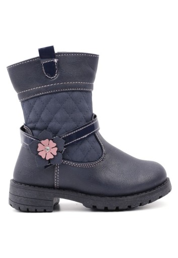 Чоботи - ботильйони для дівчинки, на плоскій підошві з протектором. Круглий ніс. Верхівка вище щиколотки. Виготовлений з екоскретку в поєднанні з матеріалом. Збоку прикрашена лакованою смужкою, що закінчується квіткою. Збоку застібається на блискавку. Утеплена модель. Ідеально підходить для стьобаних курток.