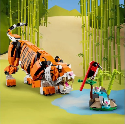 Любителям тварин буде цікаво розігрувати рольові цікаві історії з чудовим набором LEGO Creator Majestic Tiger 31129. Набір дозволяє побудувати тигра з рухомими хвостом, ногами, тілом, руками, головою та щелепами. Тварина також може робити різні гримаси.