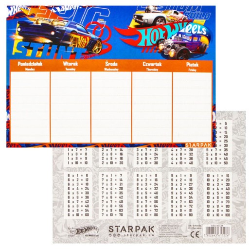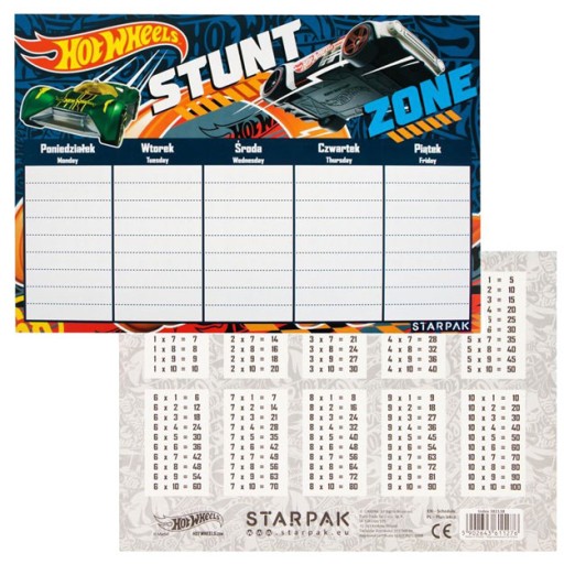 Особливості продукту: Конспект уроку є обов'язковим елементом шкільного обладнання. План з колекції STARPAK з ліцензією Hot Wheels містить поділ на п'ять днів тижня з 9 рядками для входу, завдяки чому жоден школяр не забуде про потрібні йому цього дня книжки чи зошити, а також має таблицю множення на зворотний бік. Графіка з котиками зробить кожен день у школі добре спланованим і успішним. Також ознайомтеся з іншими продуктами Starpak із серії Hot Wheels План уроків з паперу. Зроблено в Польщі. Упаковані у фольгу по 25 шт. Розміри виробу: ширина х висота 23х16 см. Вага товару в упаковці кг: 0,24 кг.