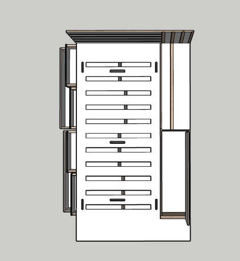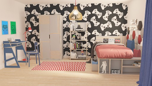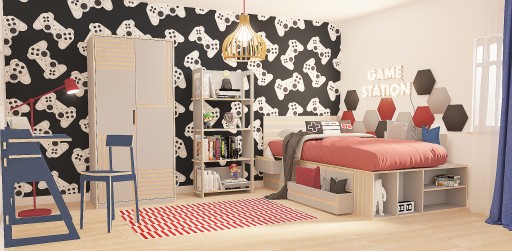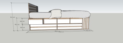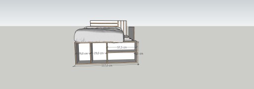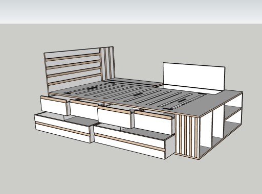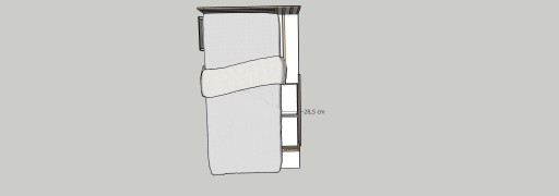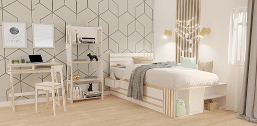 - ліжко: окрім функції сну, воно також має функцію зберігання, є чотири менші шухляди на напрямних Blum і дві більші внизу, додатково, з іншого боку у нас є відділення для зберігання, напр. Під матрацом цілісна пластина з фрезерованими отворами проти «запотіння» матраца, з боку ніжок є блокада, що не дає матрацу зісковзнути з ліжка. З передньої частини ліжка є додаткові полиці для зберігання, наприклад, книг. Декоративно фрезероване узголів'я. Ліжко можна зробити в правому або лівому варіанті.