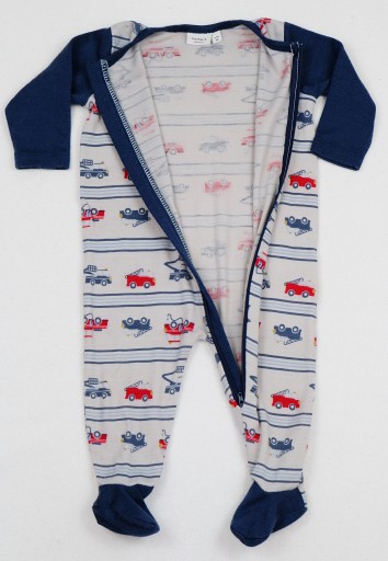 М'який комбінезон брудно-білого кольору з автомобільним принтом. Застібається на блискавку з захистом підборіддя. Темно-сині рукава