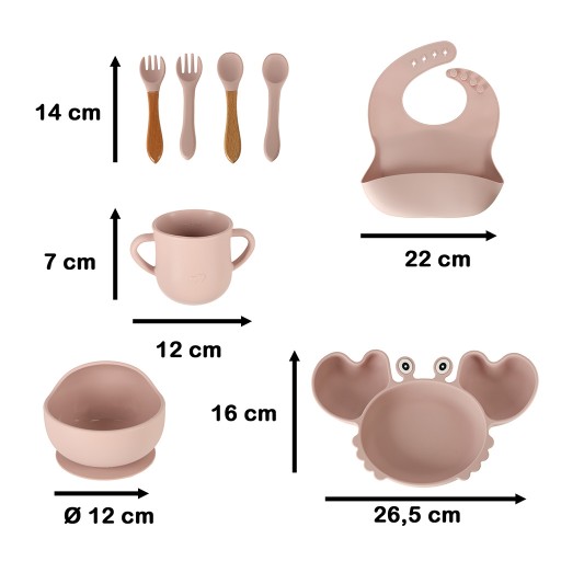 Миска і тарілка мають присоску, яка не дасть малюкові перекинути посуд - більше не буде падіння тарілок під час їжі. Тарілка має форму краба - вона буде супроводжувати малюка під час їжі та спонукати його доїдати. білизна не тільки захистить сорочку вашого малюка під час їжі, але й вловить залишки їжі, які не потраплять до рота дитини - все завдяки практичній кишені. Кожен елемент набору має гладкі краї, а розмір столових приборів спеціально адаптований до маленьких ручок - завдяки цьому малюк може користуватися приладами, вчачись їсти самостійно.