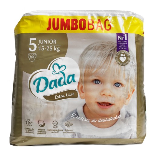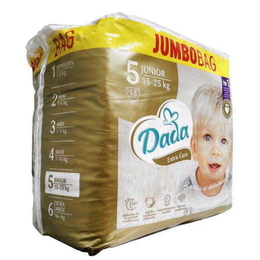 Одноразові підгузки Dada 5 JUNIOR Extra Care призначені для дітей вагою 15-25 кг.