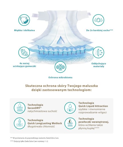 У них використовується інноваційна технологія SeconDRY, яка робить підгузки до 2 разів сухішими (порівняно з попереднім варіантом підгузків Dada Extra Care).