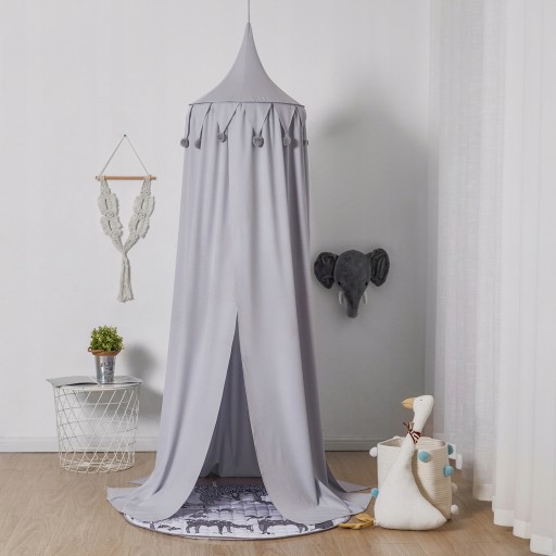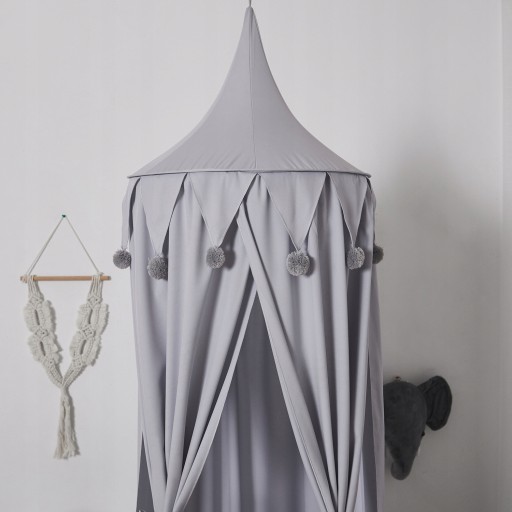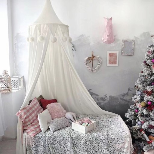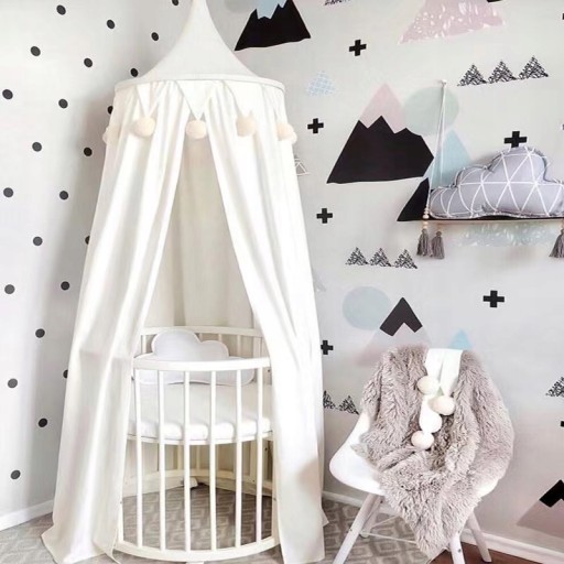 Білий балдахін з гірляндами та помпонами. Балдахін - ідеальне місце для гри як для хлопчика, так і для дівчинки. Діти люблять ховатися і мати свій власний палац для ігор. Також це ефектний елемент декору дитячої кімнати. Спочатку його можна використовувати як прикрасу дитячого ліжечка, яке буде приглушувати шум і захищати від зайвого світла і непотрібних візуальних подразників, забезпечуючи спокійний сон.