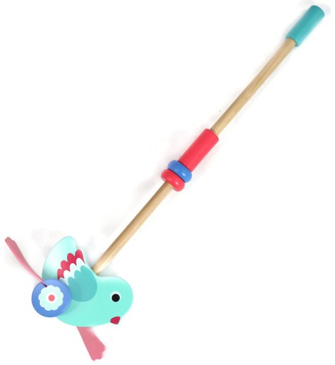 Ось ще один компаньйон для спільної прогулянки. Дитина хапає палицю і штовхає пташку перед собою. Ніжки пташки зроблені з гуми, і вона смішно каркає, коли її штовхають.