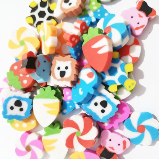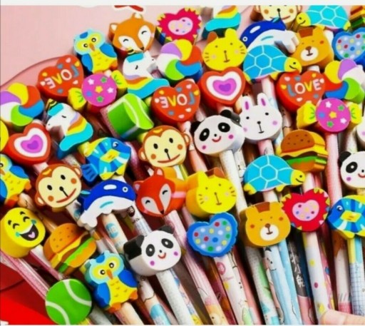 Набір кольорових олівців і олівців для малювання з декоративними гумками. Кожен кольоровий олівець і олівець мають кінчик гумки, на кожному з яких зображено різний візерунок тварин. Кожна гумка підходить до олівця або крейди, на якій вона є.