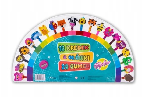 Весь набір включає 18 кольорових олівців і 2 олівці, а також 20 кольорових гумок і точилок.