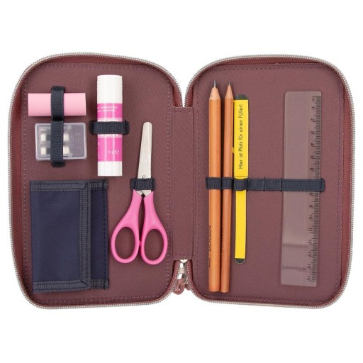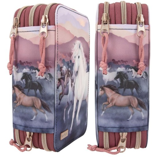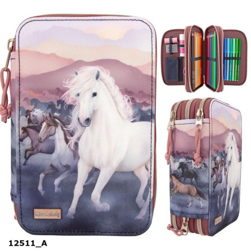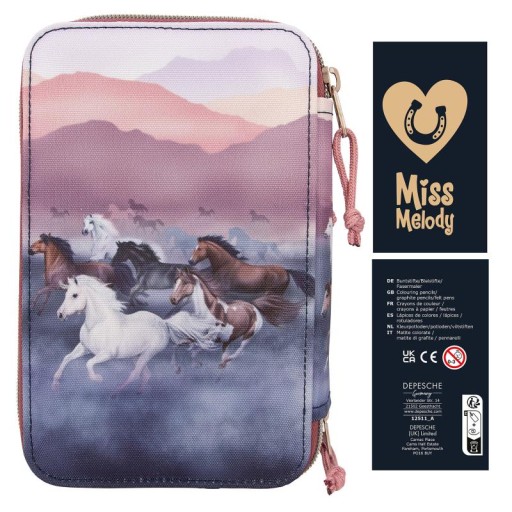Мрійливі коні скрізь: пенал Miss Melody з 3 відділеннями з красивим мотивом печі XL на тлі похмурого вечірнього неба у відтінках фіолетового та фіолетового повністю заповнений 18 кольоровими ручками та фломастерами, 2 олівцями, точилкою, гумкою, лінійкою, ножиці, клей і маленький мішечок на липучках. Матеріал: 100% поліестер