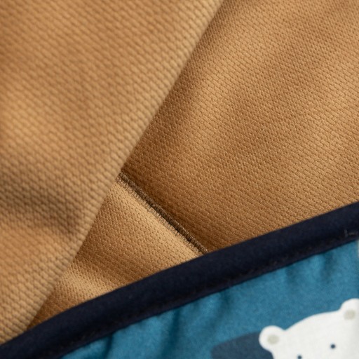 Завдяки отворам 3-точкові ремені безпеки дуже функціональні - вам не доведеться відстібати ремені безпеки, щоб розкрити дитину в колясці. На чохлі є капюшон з милими вушками, який регулюється за допомогою шнурка. Він виготовлений зі 100% бавовни.