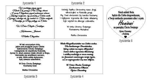 - Імена людей, які надсилають побажання (наприклад, хрещена мати та родина, тітка Єва та дядько Марек)