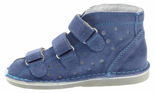 DANIEL Sklep Fabryczny - Профілактичне дитяче взуття із замші. Інтер'єр і профільована внутрішня вставка оброблені натуральною шкірою Профільована основа з каблуком - Томас - з гнучкого і легкого матеріалу - мікропористого стирогуму - відмінно передає навантаження на грунт і амортизує удари. Мікровирізи на низу формують правильну лінію згину і позиціонування стопи. Піднятий, посилений верх стабілізує стопу та гомілковостопний суглоб, а регульована застібка дозволяє точно відрегулювати взуття під різну ширину. За конструкцією, технологією та матеріалами взуття відповідає вимогам сертифікату «Здорова нога», виданого IPS у Кракові та нагороджена фахівцями знаком «ця нога» як ідеальна для запобігання формуванню правильного розвитку, функціонування та будова стопи дитини.