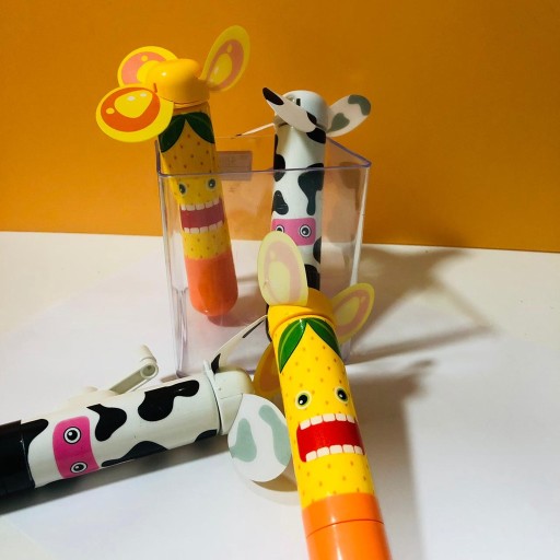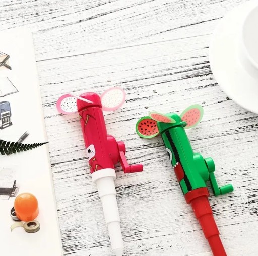 Різнокольорові вертушки - ручки. Якщо вам занадто жарко, просто поверніть рукоятку, і за мить ви відчуєте прохолодний вітерець. Однак, якщо вам потрібна ручка, просто відкрийте ковпачок і розгорніть ручку. Ручка-вертушка доступна в декількох кольорах: кавун, лічі, помаранчевий, салатовий, синій і фіолетовий. Пам'ятайте, що важливо, в якому напрямку ви повертаєте вентилятор. Якщо ви не відчуваєте прохолодного повітря, поверніть рукоятку в інший бік.