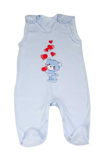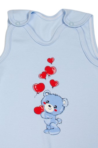 Зручний спальний комбінезон для хлопчика.На висоті ніжок декоративна трафаретка.На талії вшитий пояс із набивним трикотажем у смужку, що імітує брючний пояс.