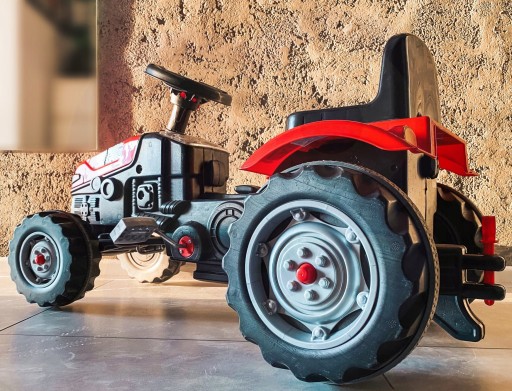 Трактор оснащений зручним сидінням, яке можна регулювати в 6 різних положеннях, забезпечуючи оптимальне налаштування під зріст і вподобання дитини. Ланцюгова передача гарантує комфортну та плавну їзду. Крім того, кермо трактора має вбудований звуковий сигнал, який додає веселощів і реалістичності водіння.