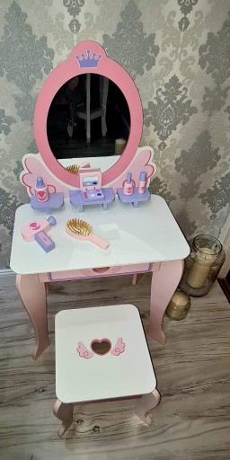 Кожна дівчина любить одягатися, робити макіяж і робити зачіску. Ви можете здивувати свою дитину цим чарівним дерев'яним туалетним столиком. Набір чудово оформлений і подарує вашій дитині масу задоволення.