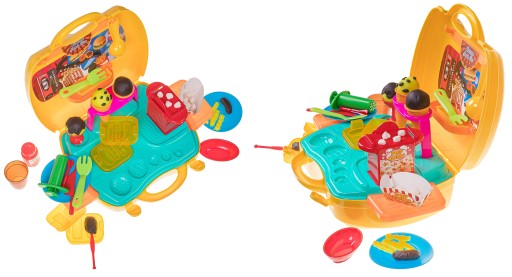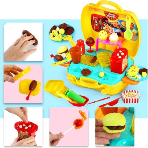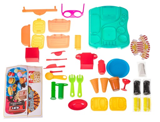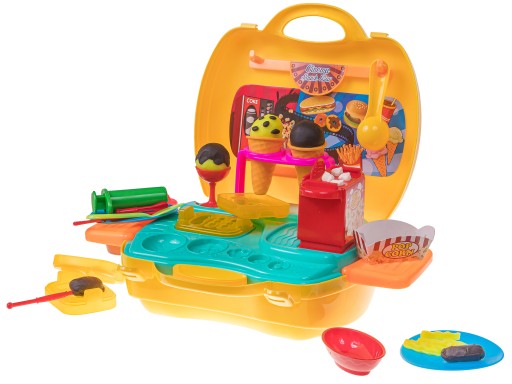 Набір містить 5 тюбиків пластиліну різних кольорів і додаткові інструменти, такі як формочки, ніж і ложки, за допомогою яких дитина зможе створювати різні фігури. У валізі також є машина для віджиму морозива, формочки для гамбургерів, аксесуари для приготування попкорну.
