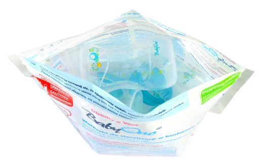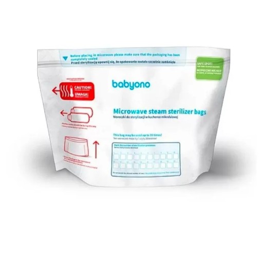 Стерилізаційні пакети для мікрохвильової печі — це простий, швидкий і безпечний спосіб стерилізації пляшечок, сосків, молоковідсмоктувачів та інших продуктів для немовлят і дітей. Це продукт, який замінює традиційний стерилізатор. Стерилізація займає всього 1,5 хвилини і проводиться в три прості кроки. Пара, яка утворюється в пакеті під час процесу стерилізації, знищує до 99,9% бактерій і мікробів. Кожен пакет можна використовувати до 20 разів. Виріб виготовлено з міцних і безпечних матеріалів, повністю не містить Бісфенол А. Продукт безпечний, надійний і функціональний.
